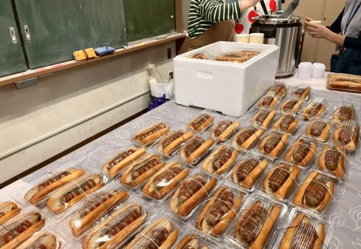 新河岸あさごはんは、今年から始まった取り組みで、事前に希望を出した児童を対象に、始業前の時間に朝ごはんを無料提供しています。今回が2回目で、今回はホットドッグとコンソメスープが提供されていました。